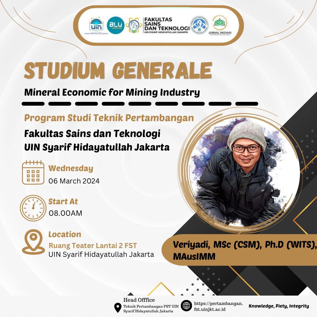 Program Studi Teknik Pertambangan UIN Syarif Hidayatullah telah mengadakan Studium General pertama di Tahun 2024 pada Rabu, 6 Maret 2024 yang bertemakan “Mineral Economic for Mining Industry” yang dibawakan oleh Bapak Veriyadi, M.Sc. (CSM), PH.D (WITS), MAusIMM. Saat ini Bapak Veriyadi merupakan seorang CEO (Chief Executive Officer) di PT VELKO. Pembahasan acara Studium General lebih ditekankan kepada tantangan-tantangan yang telah dialami perusahaan tambang di dunia, seperti decreasing demand, price shock and bubble, dan cost inflation that can reduce the margin. Selain itu, dibahas juga tantangan dari segi penjualan terhadap barang komoditas tambang, yang meliputi aspek: economy, market, geopolitics dan technology. Dengan memahami tantangan secara global tersebut, dapat membuka wawasan mahasiswa Teknik Pertambangan UIN Syarif Hidayatullah Jakarta untuk mempersiapkan dan membekali diri menghadapi dunia kerja pada perusahaan tambang.
