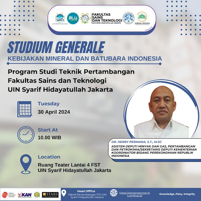 Ciputat- Studium Generale (SG) Teknik Pertambangan FST UIN Syarif Hidayatullah Jakarta dengan topik Topik “Kebijakan Mineral dan Batubara Indonesia” yang menghadirkan Dr. Herry Permana, S.T., M.Sc. yang merupakan Asisten Deputi Minyak dan Gas, Pertambangan dan Petrokimia/Sekretaris Deputi Kementerian Koordinator Bidang Perekonomian Republik Indonesia. materi yang dibawakan dengan judul : Kebijakah Energi dan Mineral Batubara Nasional, sebagai narasumber.